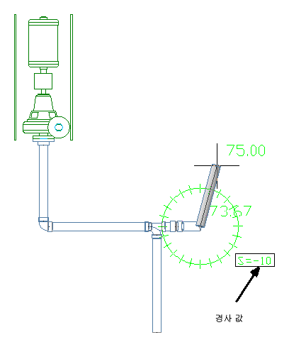 파이프 세그먼트는 파이프 특성 팔레트에 지정된 경사 값을 가지거나 사용된 특정 라우팅 솔루션에 의존하는 다른 경사 값을 가질 수 있습니다. 이 즉각적인 시각적 표시기를 통해 사용된 솔루션과 연관된 경사 값을 정확하게 알 수 있습니다. 이 피쳐를 끄려면 명령행에 PIPESLOPEDISPLAY를 입력합니다. 다음 프롬프트에 n을 입력합니다.