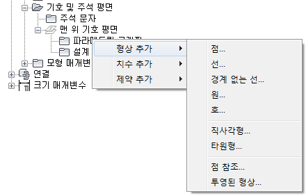 필요한 명령에 액세스하려면 다음과 같이 기호 및 주석 평면을 확장하고 파라메트릭 그래픽을 마우스 오른쪽 버튼으로 클릭한 후 상황에 맞는 메뉴의 명령을 사용합니다. 형상 추가를 클릭한 후 점 참조를 클릭합니다.