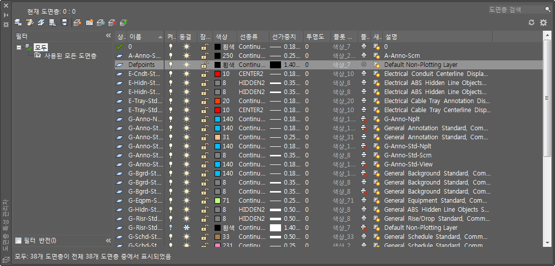 도면층 특성 관리자를 사용하면 현재 도면에서 도면층을 보고 관리할 수 있습니다.