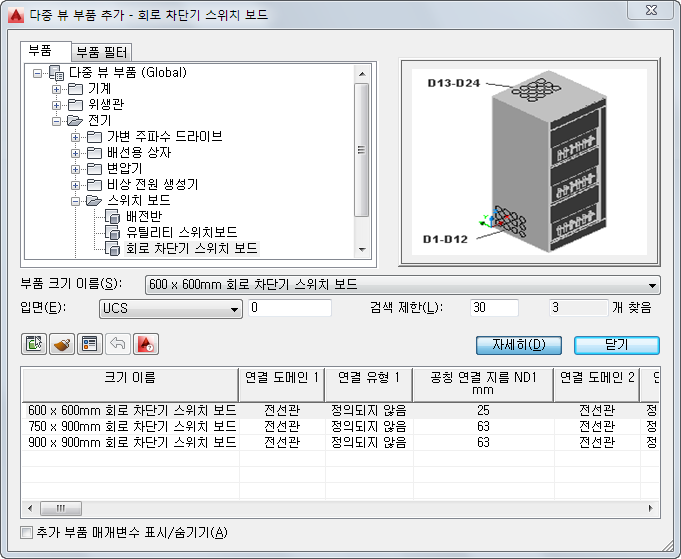 현재 카탈로그의 트리 뷰를 표시하는 다중 뷰 부품 추가 대화상자가 표시됩니다.