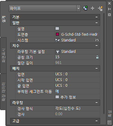 특성 팔레트의 설계 탭에서 파이프 시스템을 수정하는 데 사용할 수 있는 특성을 정의합니다.