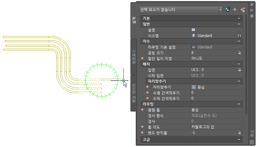 특성 팔레트에는 평행 휨을 구성하는 두 가지 옵션, 즉 동심과 고정 반지름 옵션이 있습니다. 이러한 옵션을 사용하여 평행 전선관 런에 사용할 휨 반지름 유형을 지정할 수 있습니다.