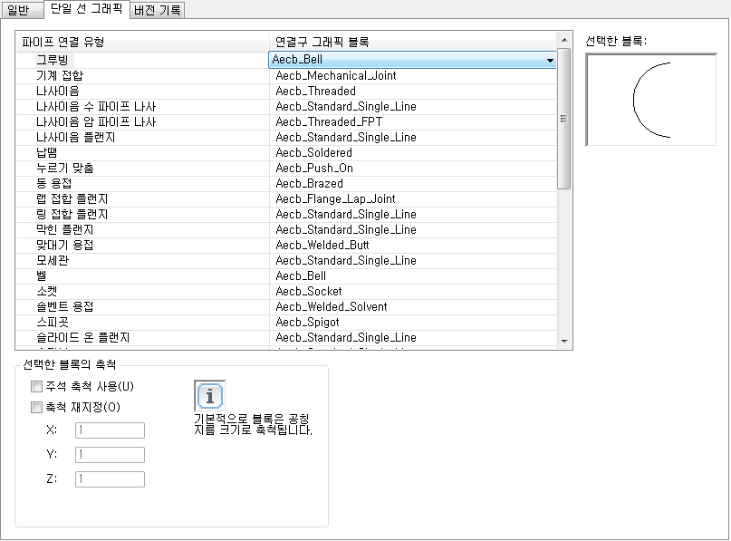 단일 선 파이프 화면표시용 그래픽을 구성할 경우 현재 도면에서 연결구 유형을 가장 근접하게 나타내는 그래픽 블록에 연결구 유형을 일치시킵니다.