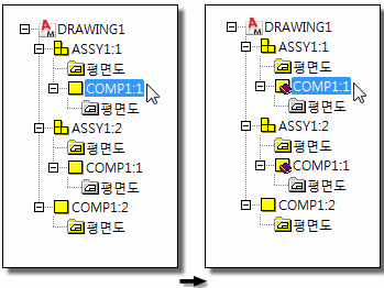 이 예에서는 조립품 ASSY1; ASSY1:1 및 ASSY1:2의 두 복제가 포함된 도면을 보여줍니다. COMP1이 ASSY1 내부(COMP1:2)뿐 아니라 외부(COMP1:1)에서도 발생합니다. ASSY1:1에서 COMP1:2을 선택하고 참조 구성요소로 지정하면 ASSY1:2의 COMP1:2도 참조 구성요소가 됩니다. 그 이유는 복제 COMP1:2가 두 번 발생하기 때문입니다(ASSY1:1에서 한 번, ASSY1:2에서 한 번). 그러나 복제 COMP1:1는 참조 구성요소가 되지 않습니다.