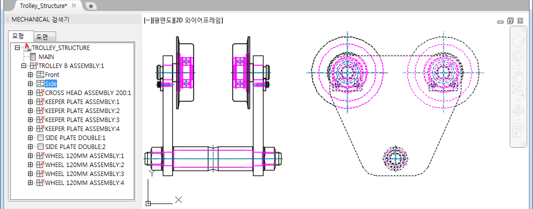 이 예에서 조립품 TROLLEY에는 모형 공간 및 Mechanical 검색기에 표시되는 두 개의 뷰가 있습니다. Mechanical 검색기에서 선택된 뷰는 모형 공간에서 강조됩니다.