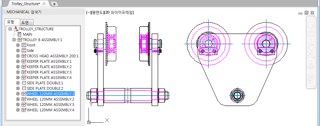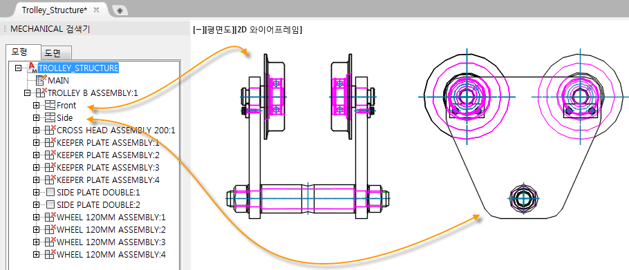 각 구성요소에는 하나 이상의 구성요소 뷰가 있습니다. 이 예에서는 조립품 구성요소 TROLLEY B ASSEMBLY에 구성요소 뷰가 두 개 있습니다.