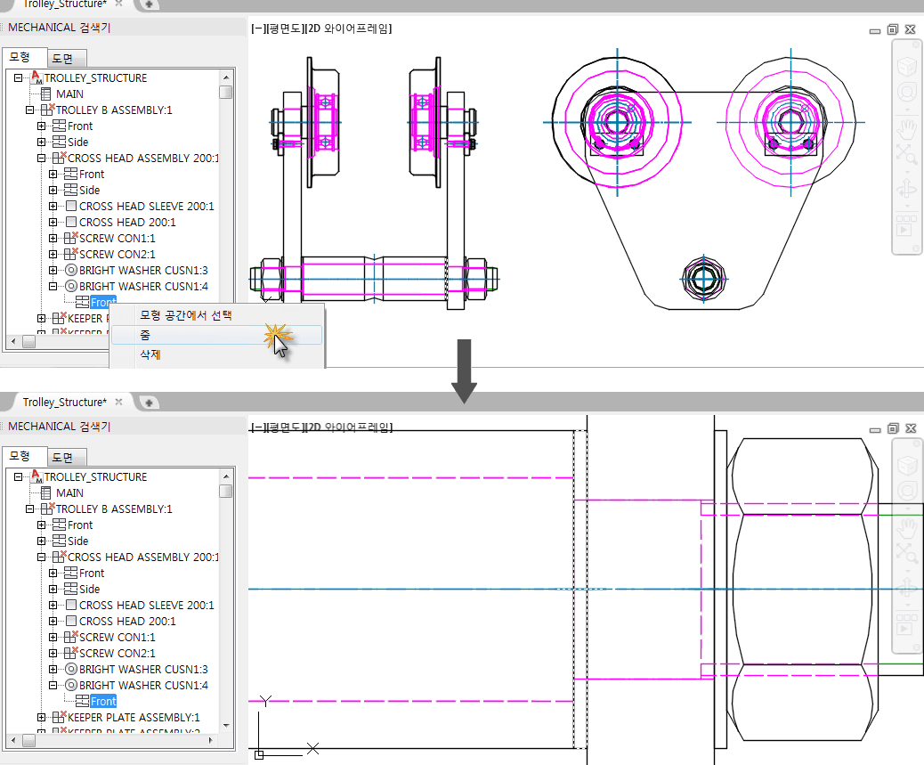 Mechanical 검색기에서 구성요소, 구성요소 뷰 또는 폴더를 마우스 오른쪽 버튼으로 클릭하고 줌을 선택하면 도면 영역에 해당 객체가 가능한 한 크게 표시됩니다.