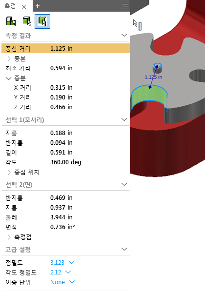 - 그래픽 창에서 측정할 형상을 클릭하여 선택합니다.