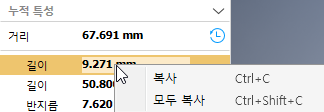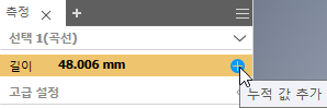 그래픽 창에서 필요한 만큼 여러 항목을 선택하고 측정 패널에서 측정 유형 옆에 있는 더하기 기호를 클릭하여 누적된 그룹에 값을 추가합니다. 해당 값은 측정 유형에 해당하는 누적 그룹에 표시됩니다. 예를 들어, 반지름은 누적 특성의 거리 그룹에 추가되고, 각도는 각도 그룹에 추가됩니다.