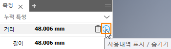 누적 특성 섹션에 선형, 면적, 체적 및/또는 각도 측정값을 추가하려면 그래픽 창에서 항목을 선택한 후 측정 유형 옆에 있는 더하기 기호를 클릭합니다. 예를 들어, 그래픽 창에서 선을 선택한 후 측정 옆에 있는 더하기 기호를 클릭합니다. 해당 값이 누적 특성 아래의 거리 측정 그룹에 추가됩니다. 거리 옆의 사용내역 표시/숨기기를 클릭하여 방금 추가한 값을 표시합니다.