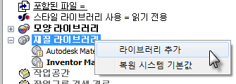 - 재질 라이브러리 노드를 마우스 오른쪽 버튼으로 클릭하고 라이브러리 추가를 클릭합니다.