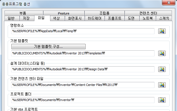 기본적으로 Autodesk Inventor와 함께 제공된 Inventor 템플릿은 C:₩Program Files₩Autodesk₩Inventor <버전>₩Templates 또는 C:₩Users₩Public₩Documents₩Autodesk₩Inventor <버전>₩Templates에 있습니다. 응용프로그램 옵션, 파일 탭에서 템플릿 위치를 가져올 수 있습니다. 네트워크 환경에서 작업하는 경우 이 폴더는 로컬 하드 드라이브가 아니라 네트워크의 공유 위치에 있습니다. 이 위치를 잘 모르는 경우 IT 또는 CAD 관리자에게 문의하십시오.