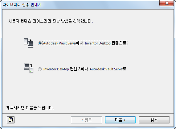 2. "라이브러리 전송 안내서..." 버튼을 클릭하여 라이브러리 전송 안내서 대화상자를 시작합니다. 그림 2를 참고하십시오. Autodesk Vault Server에서 Inventor Desktop 컨텐츠로를 선택합니다.