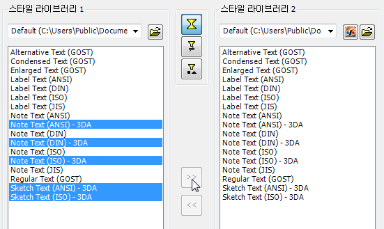 스타일 라이브러리를 새 Inventor 버전으로 변환했으면 새 라이브러리에 복사할 스타일 집합(있는 경우)을 선택합니다. 예를 들어, 스타일 라이브러리 1 창에서 한 가지 스타일을 선택합니다. 하나 이상의 스타일을 선택한 후 선택한 스타일을 스타일 라이브러리 1에서 스타일 라이브러리 2로 복사 버튼을 클릭하여 새 라이브러리에 추가합니다.