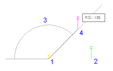 도면에서 기존 선을 선택하거나 선의 시작점과 끝점(1과 2)을 지정하여 편향 각도를 측정할 선을 선택합니다. 그런 다음 시작점에서의 편향 각도(3)와 거리(4)를 지정합니다.