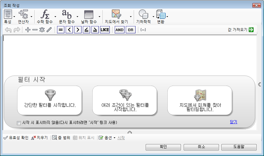 실제로는 표현식을 작성하기 전에 조회할 피쳐 클래스 또는 도면층을 선택하여 데이터 세트를 지정합니다. 적용할 작업은 표현식을 작성하기 위한 명령을 선택할 때 지정합니다. 예를 들어, AutoCAD Map 3D toolset에서 조회를 사용하여 지도에 추가 또는 검색하여 선택을 선택합니다.