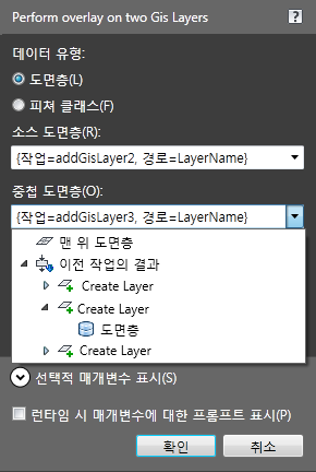 이전 작업에서 만들어진 도면층을 사용하려면 이전 작업의 결과 아래의 리스트에서 선택합니다.
