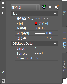 객체 분류를 사용하여 작성된 객체를 선택하면 해당 객체 클래스와 연관된 특성이 특성 팔레트의 객체 클래스 탭에 표시됩니다. 예를 들어, 도로를 선택하면 특성 팔레트에 도면층, 선가중치, 지표면 유형 및 차선 수가 표시됩니다. 창에 새 값을 입력하여 특성을 편집합니다.