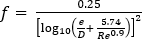 Swamee-Jain 방정식은 암시적 Colebrook-White 방정식의 가장 일반적인 근사치로서 냉각수 유동에 사용되는 기본 근사치이며, 다음 방정식으로 지정됩니다.