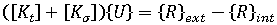 는 현재 구성에서 잔류(불균형) 절점력의 벡터입니다. 이러한 방정식은 비선형이며 직접 해결할 수 없습니다. 대신 좌변은 예측 변수로 사용되고 우변은 수정자로 사용되는 고전적 예측 수정자 반복 기술(예: Newton-Raphson 또는 준 Newton)을 사용할 수 있습니다. 일반적인 성공 반복 사이클 중에는 구조의 구성이 실제 평형 구성으로 수렴되는 동시에 잔류 불균형 힘