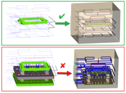 단일 단계로 CAD 금형 블록을 만들거나, 금형 블록을 리전으로 만들고 만족스러운지 확인한 다음 이 리전에서 CAD 금형을 만들 수 있습니다. 단일 단계로 CAD 금형을 생성하는 작업의 성공 여부는 부품 및 인서트의 무결성에 달려 있습니다. CAD 부품/인서트에 형상 오류가 있는 경우 CAD 금형 블록 생성에 실패하거나 오류와 함께 성공할 가능성이 높습니다. CAD 금형 블록 생성이 기본 옵션으로 설정되지 않은 이유는 부품/인서트에 형상 오류가 없어야 하기 때문입니다.