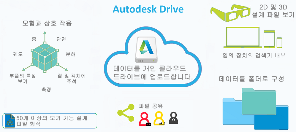 Autodesk Drive는 개인 및 소규모 팀이 모든 유형의 설계 또는 모형 데이터를 구성, 미리보기 및 공유할 수 있는 클라우드 저장소 솔루션입니다.