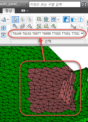 삼각형 요소에 식별 레이블 'T'가 지정됩니다. 삼각형을 선택하면 문자 T와 숫자로 구성된 식별자가 선택 목록에 나열됩니다.