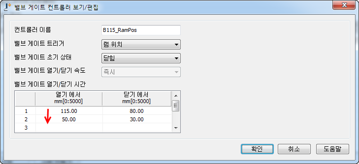 - 밸브 게이트 열기/닫기 시간 테이블에 적절한 값을 입력하고 공정 설정 대화상자에 입력한 값과 일치하는지 확인하십시오.