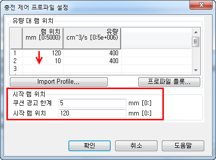 - 프로파일 편집을 클릭하고 충전 제어 프로파일 설정 대화상자에서 적절한 값을 입력합니다. 이러한 값은 나중에 만들 밸브 게이트 컨트롤러 프로파일과 일치해야 합니다.