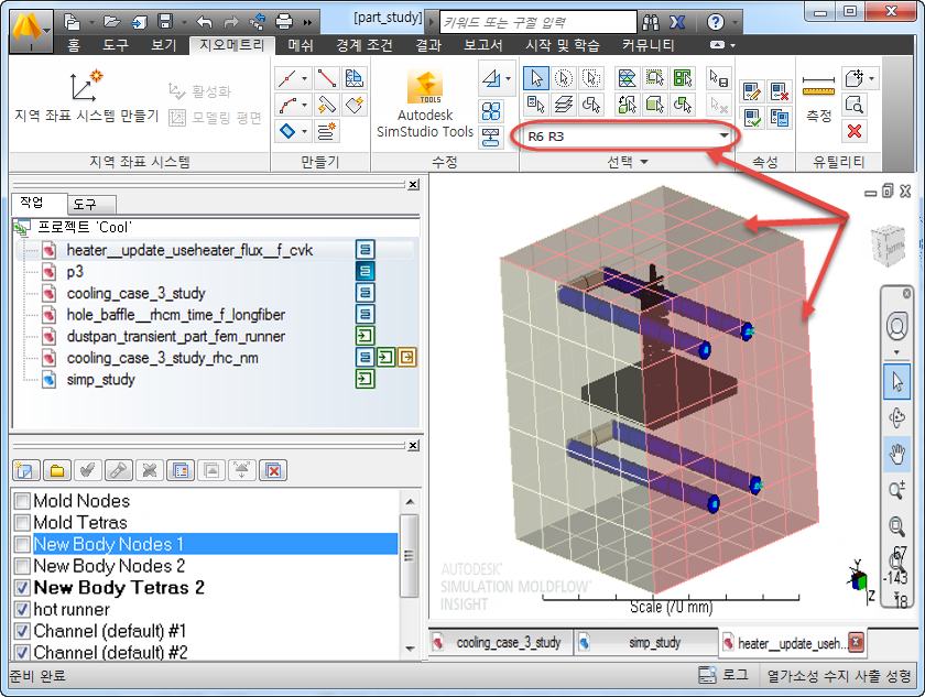 Moldflow Insight에서 만든 성분(예: 분할면, 금형 면, 금형 삽입물)을 리전이라고 합니다. 리전의 경계선은 곡선 또는 직선이 될 수 있지만 완전히 연결되고 간섭이 없어야 합니다.