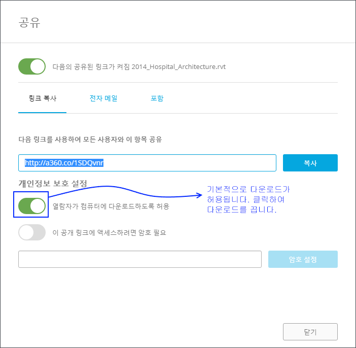 기본적으로 다운로드 옵션은 공유 링크에 대한 것입니다. 이 옵션을 해제할 수 있습니다. 또한 파일에 대해 암호를 설정할 수 있습니다.