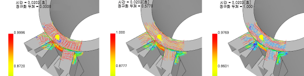 그림 1에서는 사출 사이클 동안 섬유 배향 텐서 결과의 변화를 나타내는 파란색(낮은 확률) 텐서의 증감을 차례로 보여줍니다.