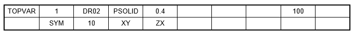 1. The topologically designable element properties include PSHELL, PCOMP, and PSOLID. Multiple TOPVAR entries are allowed in a single file. Those elements whose PID is not specified in TOPVAR entries are considered to be non-designable elements; that is, they are considered to be fully filled by the material and are not changed during topology optimization.