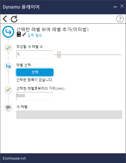 일부 Dynamo 스크립트는 실행되기 전에 입력을 요구합니다. Dynamo 플레이어가 이러한 입력을 제공하도록 설정하여 현재 모델에서의 요구 사항에 맞도록 스크립트를 즉시 조정할 수 있습니다.