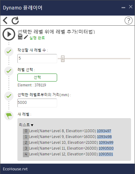 스크립트가 성공적으로 실행되면 상태가 실행 완료로 변경됩니다. Dynamo 플레이어에 노출되는 Watch 노드의 경우 입력 대화상자에 결과에 대한 정보가 표시됩니다.