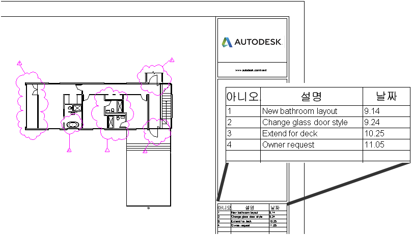 수정기호 일람표를 포함하는 제목 블록을 사용하여 시트에 수정기호 일람표를 표시합니다.