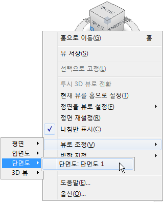 ViewCube를 사용하여 3D 뷰의 방향을 투영의 평면도, 입면도, 구획도 또는 3D 뷰로 지정할 수 있습니다.