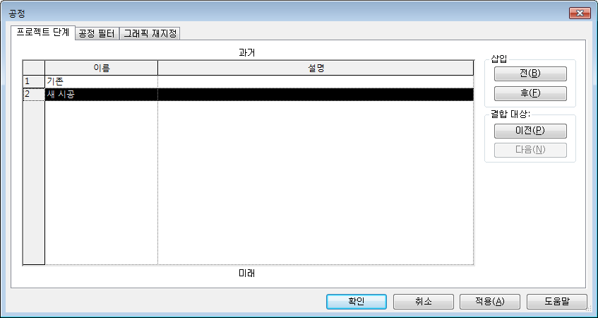 공정 대화상자가 열리고 프로젝트 공정 탭이 표시됩니다. 기본적으로 각 프로젝트에는 기존 시공 및 새 시공이라는 공정이 있습니다.
