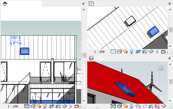 예를 들어, 뷰를 바둑판식으로 배열하면 입면도에서 변경했을 때 이 변경사항을 3D 뷰 및 평면도에서 볼 수 있습니다. 다음 이미지에서는 입면뷰에서 선택된 천창이 다른 타일 뷰에서도 선택된 것을 볼 수 있습니다.