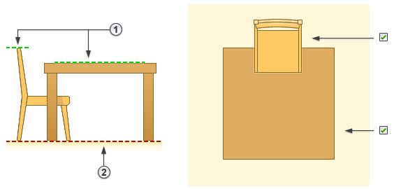 다음 이미지에서는 의자 패밀리와 테이블 패밀리를 보여주는데, 두 패밀리 모두에는 마스킹 영역(빨강 파선)이 참조 레벨에 스케치되어 있습니다.