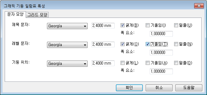 그래픽 기둥 일람표에서 문자 형식을 조정할 수 있습니다. 특성 팔레트의 문자 섹션에서 문자 모양 편집 버튼을 클릭합니다.