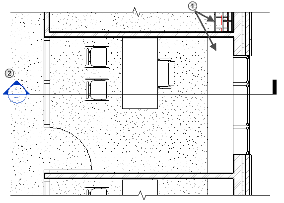 건축 및 구조 요소(벽, 문, 창, 가구)는 뷰 범위에 기반하여 중간색으로 표시됩니다. 천장 요소는 뷰에 표시되지 않습니다.