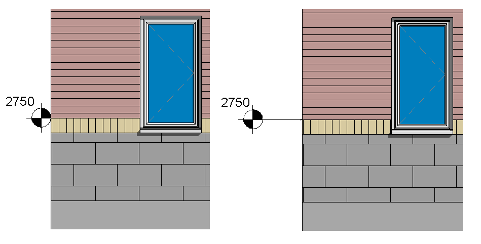 - 지시선 및 보조선과 함께 배치하려는 경우 커서를 요소에서 떨어진 위치로 이동합니다. 한 번 클릭하여 지시선 보조선을 배치합니다. 커서를 다시 이동한 후 클릭하여 지정점 레벨을 배치합니다.