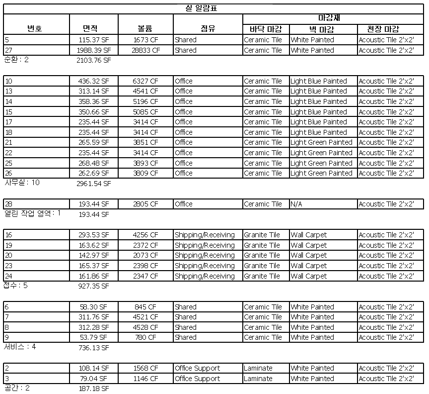 모든 일람표는 프로젝트 수정 시 자동으로 업데이트됩니다. 예를 들어 벽을 이동하면 따라서 룸 일람표에서 정사각형 피트 단위가 업데이트됩니다.