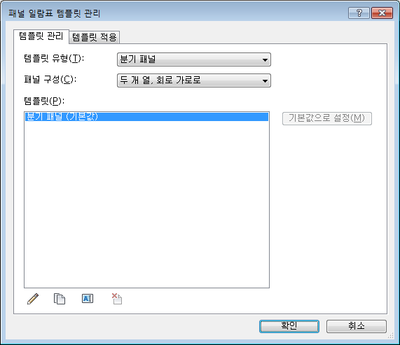 패널 일람표 템플릿 관리 대화상자를 사용하여 패널 일람표 템플릿을 편집, 복제, 삭제 및 적용할 수 있습니다. 또한 기본 템플릿도 지정할 수 있습니다.