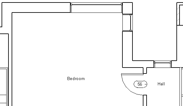 문을 배치한 후 문 스윙을 변경하는 경우 이 변경사항이 일람표에 자동으로 반영되지 않습니다. 일람표에는 초기 문 배치 데이터가 그대로 유지됩니다. 따라서 문 56의 특정 문 개구부는 문 스윙에 상관없이 항상(기본적으로) 거실에서 침실 방향으로 열립니다. 문 56이 침실에서 거실 방향으로 열리게 하려면 평면 뷰에서 문 스윙을 변경한 다음 문 일람표에서 해당하는 필드를 편집합니다.