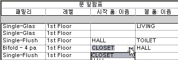 문 일람표가 열립니다. 문을 배치한 후 문 스윙에 대해 변경하는 사항이 끝 룸 및 시작 룸 필드에 자동으로 반영되지 않으므로 리스트에서 값을 선택하여 이러한 필드를 편집할 수 있습니다.