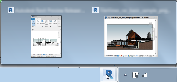 이러한 추가 창은 Windows 작업 표시줄의 Revit 아이콘 아래에 표시됩니다. 아이콘 위에 마우스를 놓으면 열려 있는 창의 미리보기를 보고 창에 액세스하며 창을 닫을 수 있습니다.