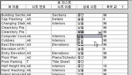 뷰 리스트를 사용하여 여러 뷰의 매개변수를 한 번에 보고 수정할 수 있습니다. 예를 들어 뷰 리스트에 상세 수준과 축척 매개변수를 포함한다고 가정합니다. 뷰 리스트에서 선택한 뷰의 상세 수준을 낮음, 중간 또는 높음으로 변경하거나 뷰 축척을 변경하여 일관된 설정을 사용할 수 있습니다. 시트에 표시되는 뷰 이름이나 뷰 제목을 변경할 수도 있습니다. 이 방법으로 뷰 리스트를 사용하면 한 위치에서 일관성 없는 뷰 설정을 식별하고 수정할 수 있습니다.