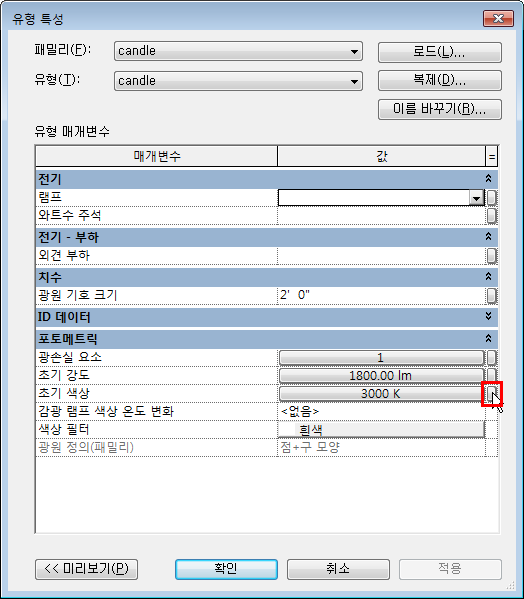 - 패밀리 카테고리 및 매개변수 대화상자의 패밀리 매개변수에서 광원을 선택합니다.